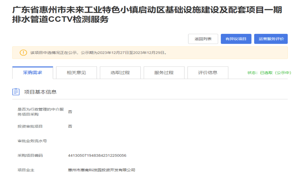 【招標公示】廣東省惠州市未來工業(yè)特色小鎮(zhèn)啟動區(qū)基礎設施建設及配套項目一期排水管道CCTV檢測服務