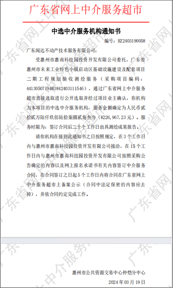 中選中介服務(wù)機(jī)構(gòu)通知書(shū)(廣東省惠州市未來(lái)工業(yè)特色小鎮(zhèn)啟動(dòng)區(qū)基礎(chǔ)設(shè)施建設(shè)及配套項(xiàng)目二期工程規(guī)劃驗(yàn)收測(cè)繪服務(wù))