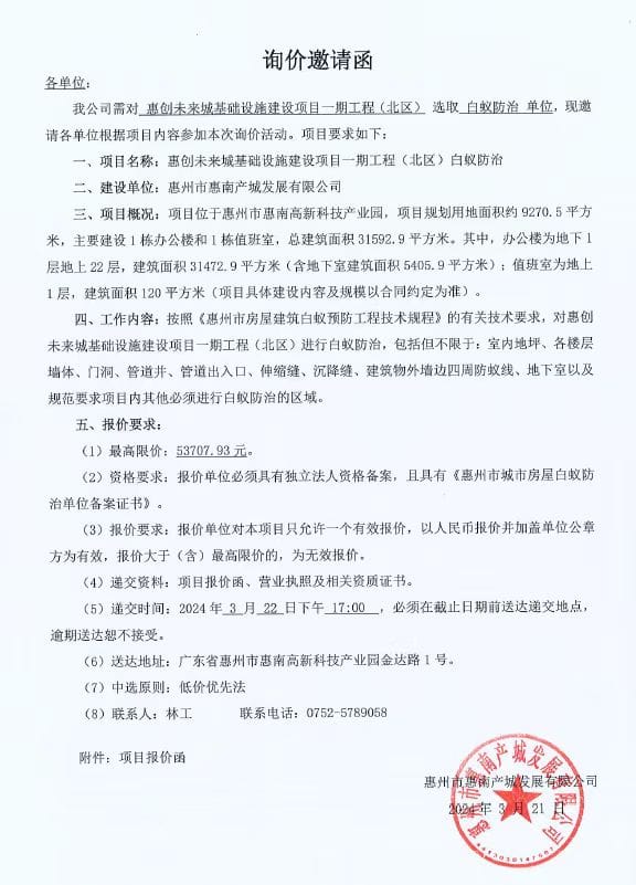 惠創(chuàng)未來城基礎(chǔ)設(shè)施建設(shè)項(xiàng)目一期工程(北區(qū))白蟻防治詢價(jià)邀請(qǐng)函