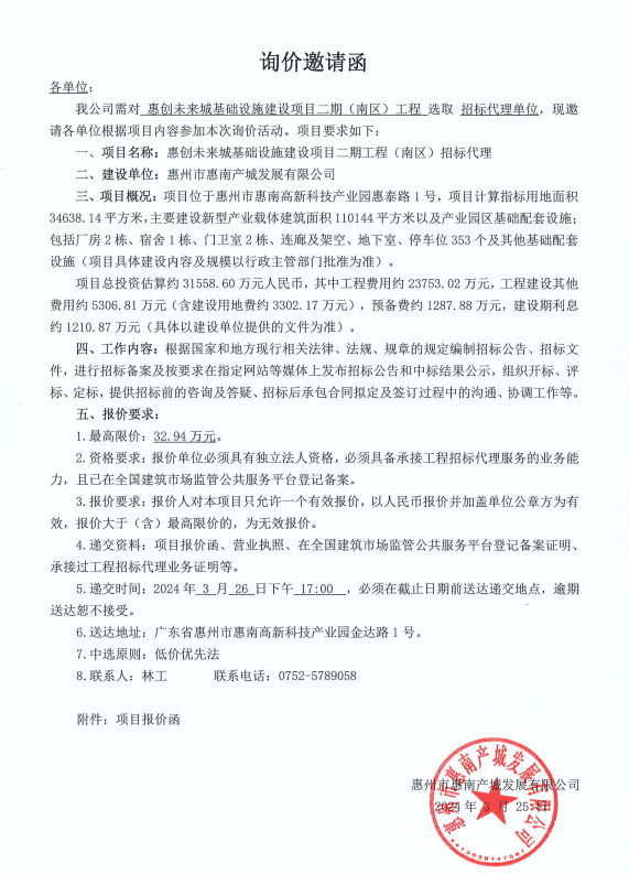 【詢價(jià)邀請函】選取惠創(chuàng)未來城24360kVA配電工程招標(biāo)代理單位