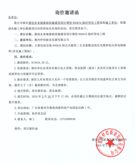 【詢價(jià)邀請(qǐng)函】惠創(chuàng)未來(lái)城基礎(chǔ)設(shè)施建設(shè)項(xiàng)目東側(cè)彈性道路(北段)及北側(cè)遷改工程質(zhì)量檢測(cè)服務(wù)