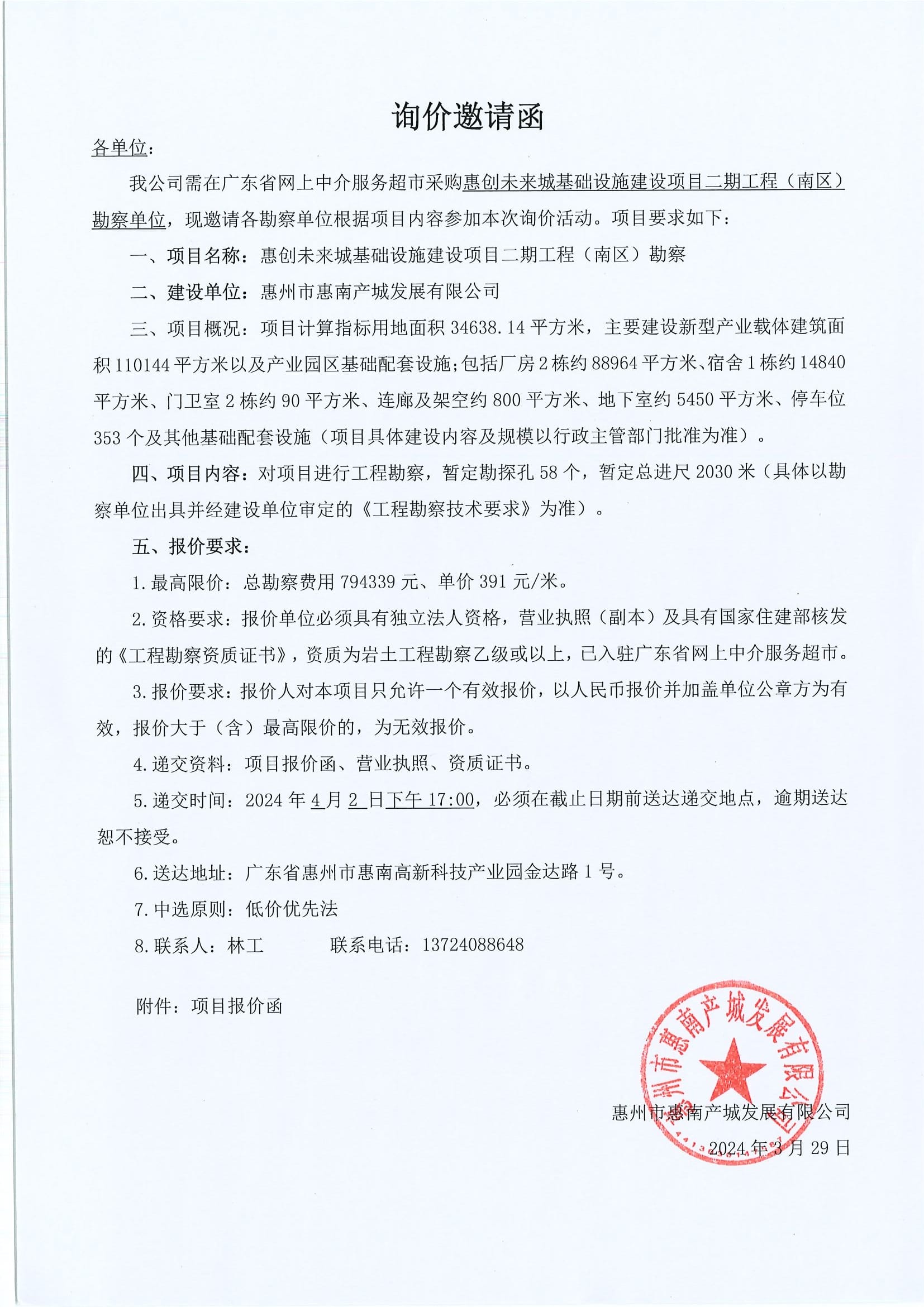 惠創(chuàng)未來(lái)城基礎(chǔ)設(shè)施建設(shè)項(xiàng)目二期工程(南區(qū))勘察詢價(jià)邀請(qǐng)函