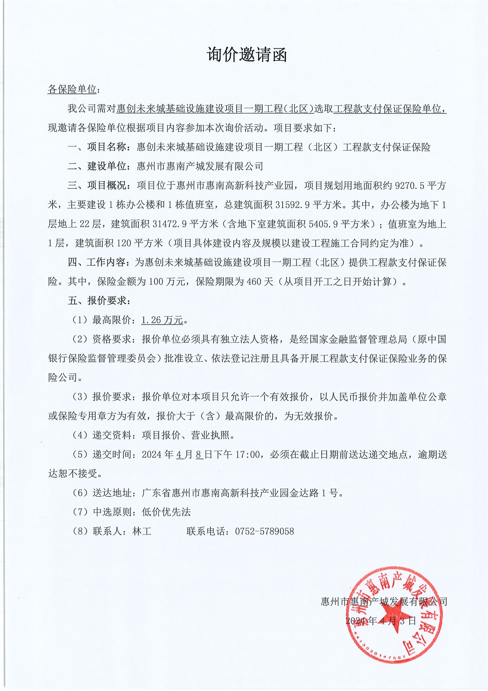 惠創(chuàng)未來城基礎(chǔ)設(shè)施建設(shè)項目一期工程(北區(qū))工程款支付保證保險詢價邀請函