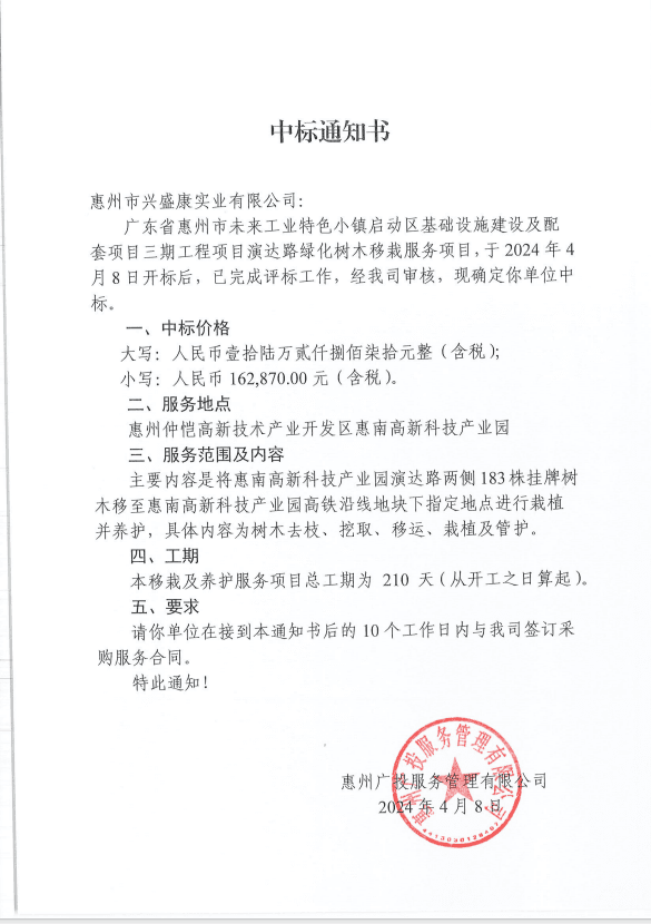【中標(biāo)通知】廣東省惠州市未來(lái)工業(yè)特色小鎮(zhèn)啟動(dòng)區(qū)基礎(chǔ)設(shè)施建設(shè)及配套項(xiàng)目三期工程項(xiàng)目演達(dá)路綠化樹(shù)木移栽服務(wù)