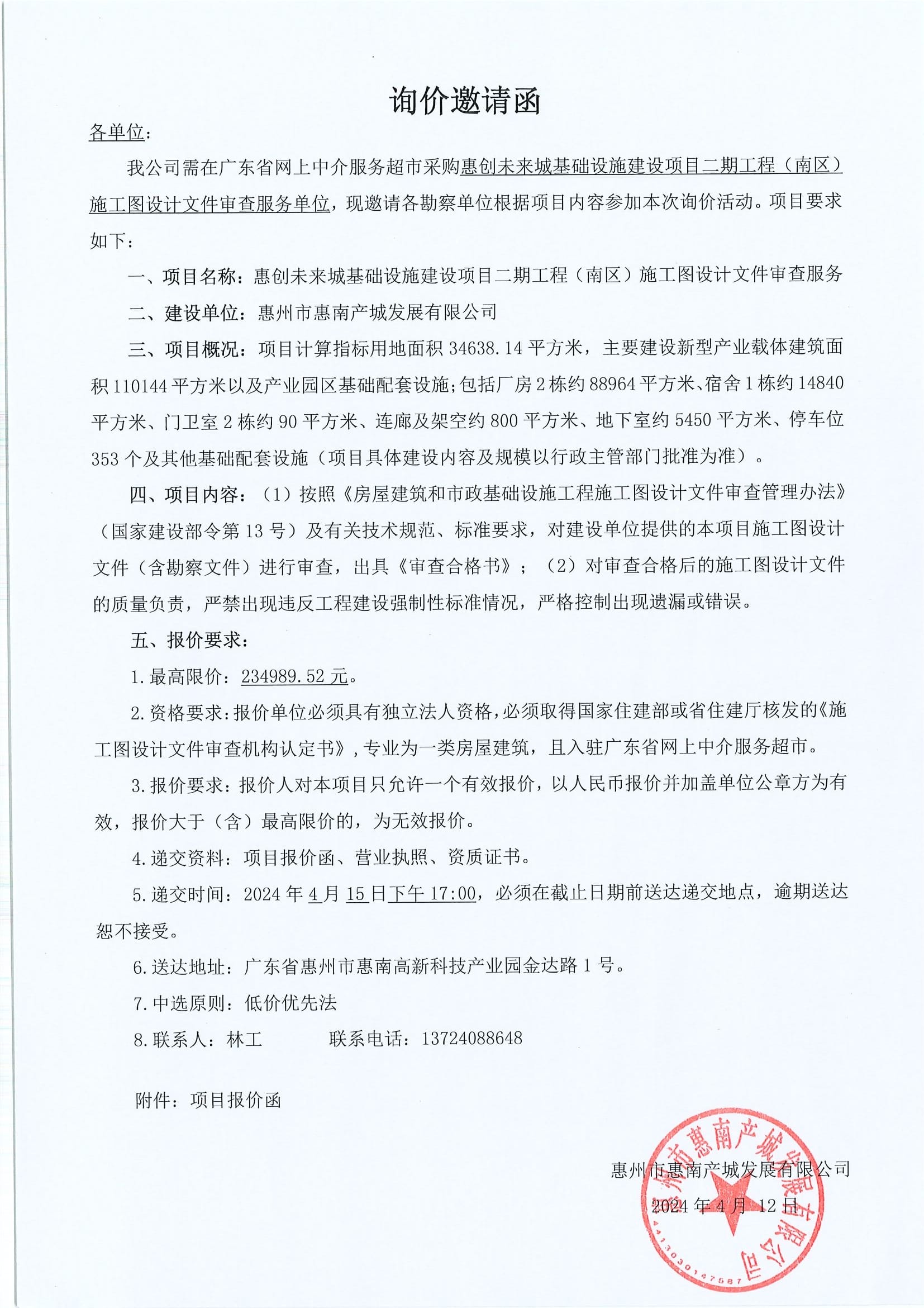 惠創(chuàng)未來城基礎(chǔ)設(shè)施建設(shè)項目二期工程(南區(qū))施工圖設(shè)計文件審查服務(wù)詢價邀請函