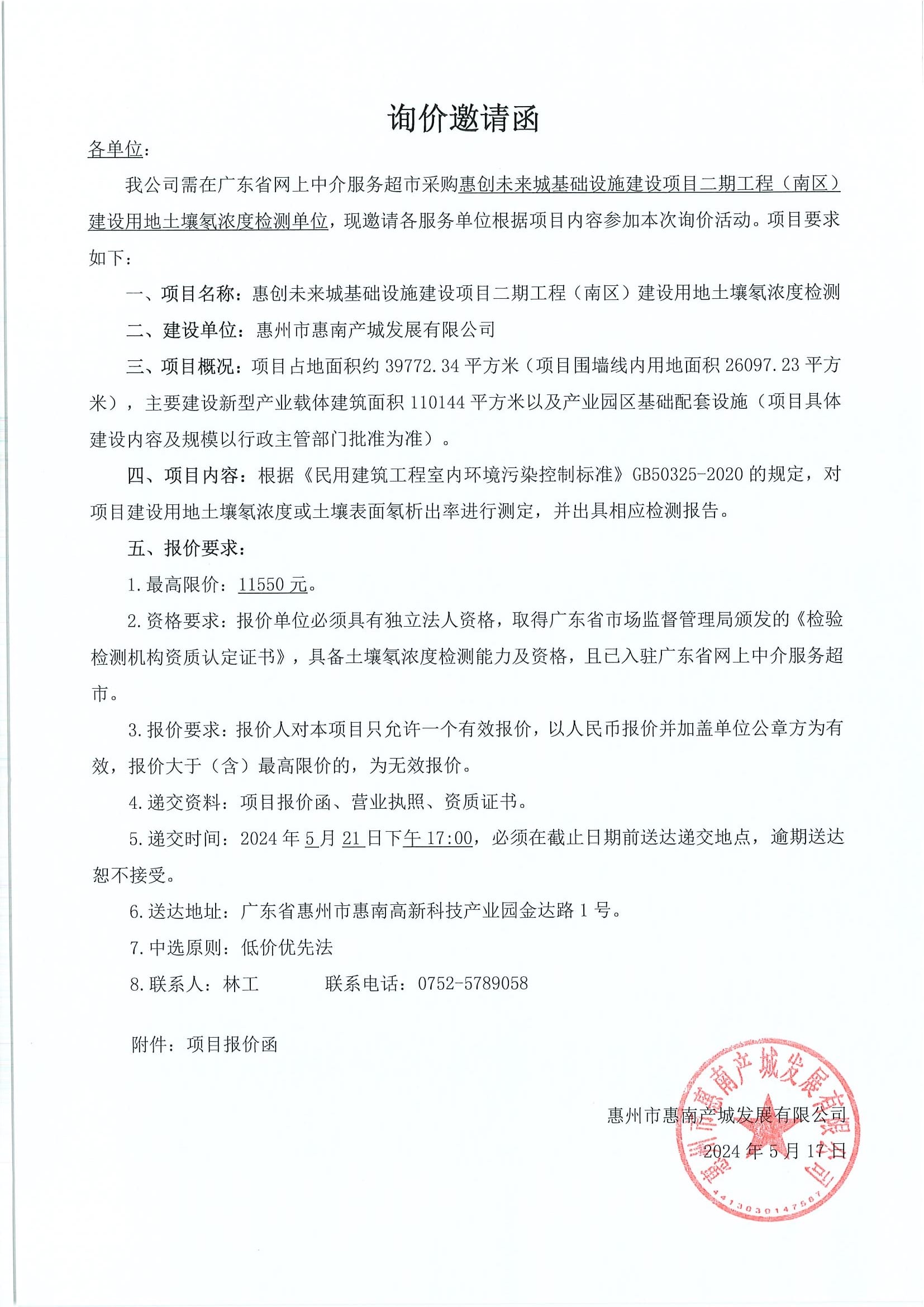 惠創(chuàng)未來城基礎(chǔ)設(shè)施建設(shè)項目二期工程(南區(qū))建設(shè)用地土壤氡濃度檢測服務(wù)詢價邀請函
