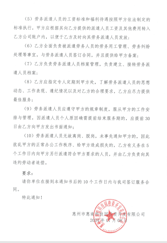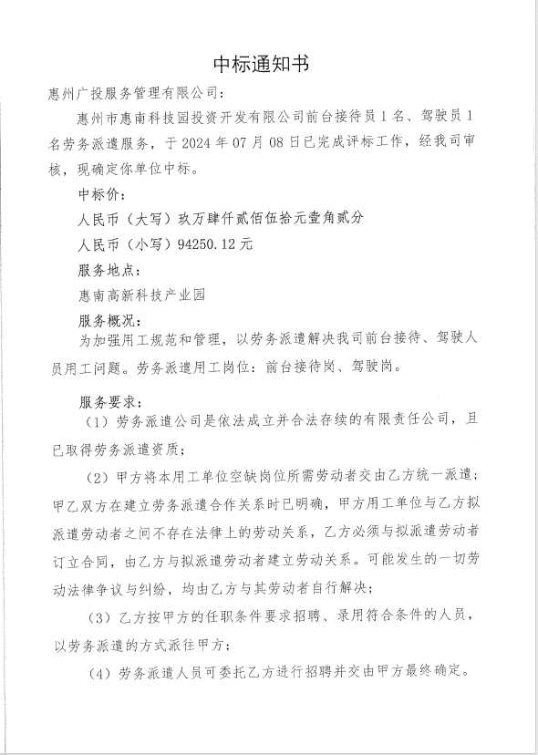 【中標(biāo)通知】惠州市惠南科技園投資開(kāi)發(fā)有限公司前臺(tái)接待員1名、駕駛員1 名勞務(wù)派遣服務(wù)