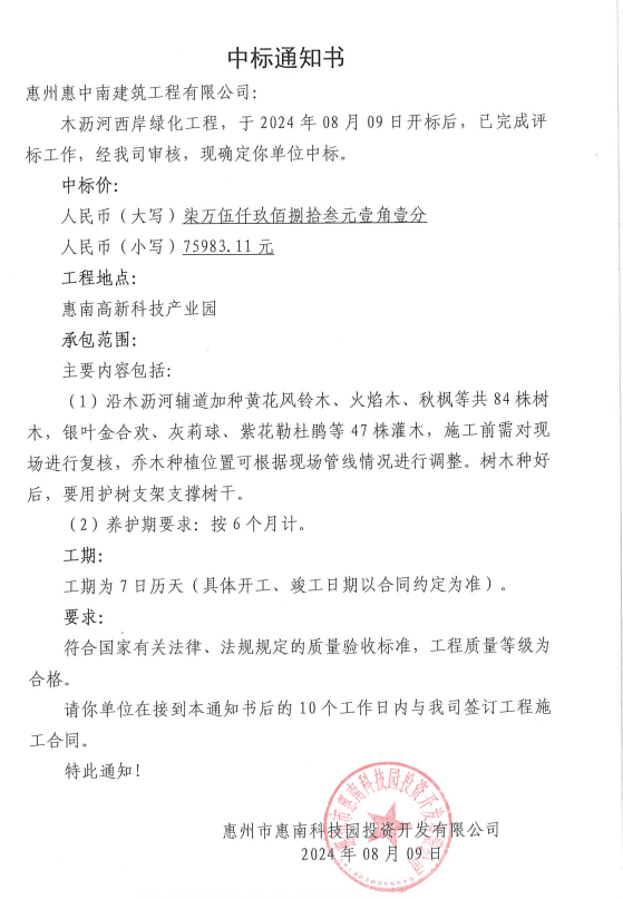 【中標(biāo)通知】木瀝河西岸綠化工程