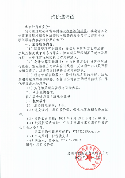 【報(bào)價(jià)邀請(qǐng)函】惠州仲愷新業(yè)發(fā)展有限公司2026年度辦公設(shè)備及相應(yīng)的辦公耗材、設(shè)備維修保養(yǎng)服務(wù)定點(diǎn)采購(gòu)項(xiàng)目
