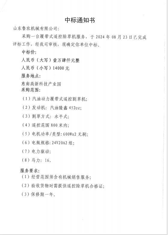 【中標通知】采購一臺履帶式遙控除草機服務