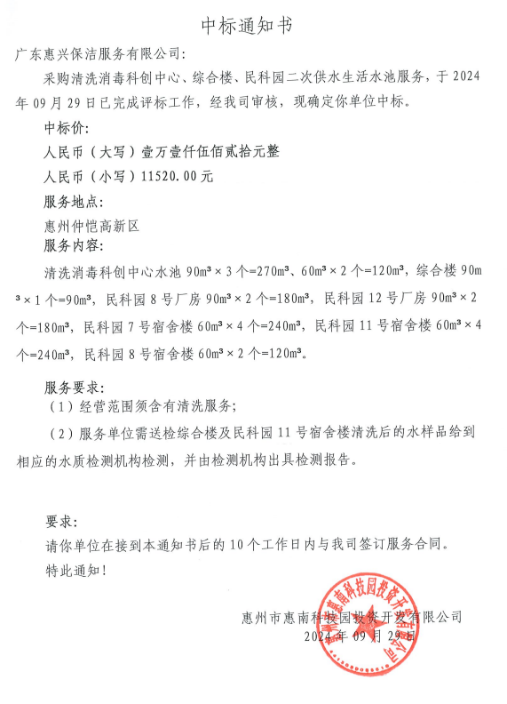 【中標通知】采購清洗消毒科創(chuàng)中心、綜合樓、民科園二次供水生活水池服務