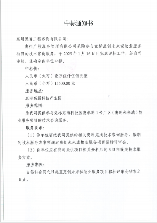【中標(biāo)通知】惠創(chuàng)未來(lái)城物業(yè)服務(wù)項(xiàng)目的技術(shù)咨詢服務(wù)