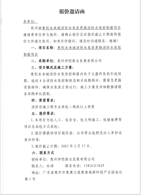 【報(bào)價(jià)邀請函】惠創(chuàng)未來城廠區(qū)新增水表項(xiàng)目