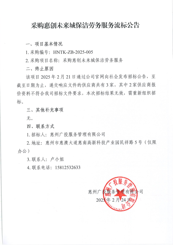 【招標(biāo)公告】采購(gòu)惠創(chuàng)未來(lái)城保潔勞務(wù)服務(wù)流標(biāo)公告