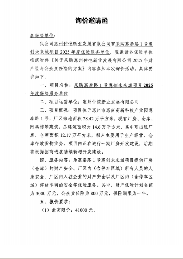【詢價邀請函】采購惠泰路1號惠創(chuàng)未來城項目2025年度保險服務(wù)單位
