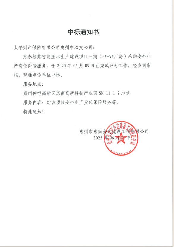【中標(biāo)通知】惠泰智慧智能顯示生產(chǎn)建設(shè)項(xiàng)目三期(6#-9#廠房)采購安全生產(chǎn)責(zé)任保險(xiǎn)服務(wù)