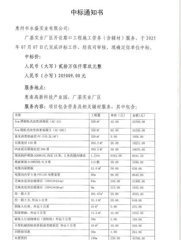 【中標(biāo)通知】廣基實業(yè)廠區(qū)開設(shè)路口工程施工勞務(wù)(含輔材)服務(wù)