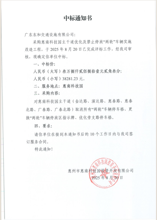 【中標(biāo)通知】采購惠南科技園主干道優(yōu)化及禁止停放“兩輪”車輛實施改造工程