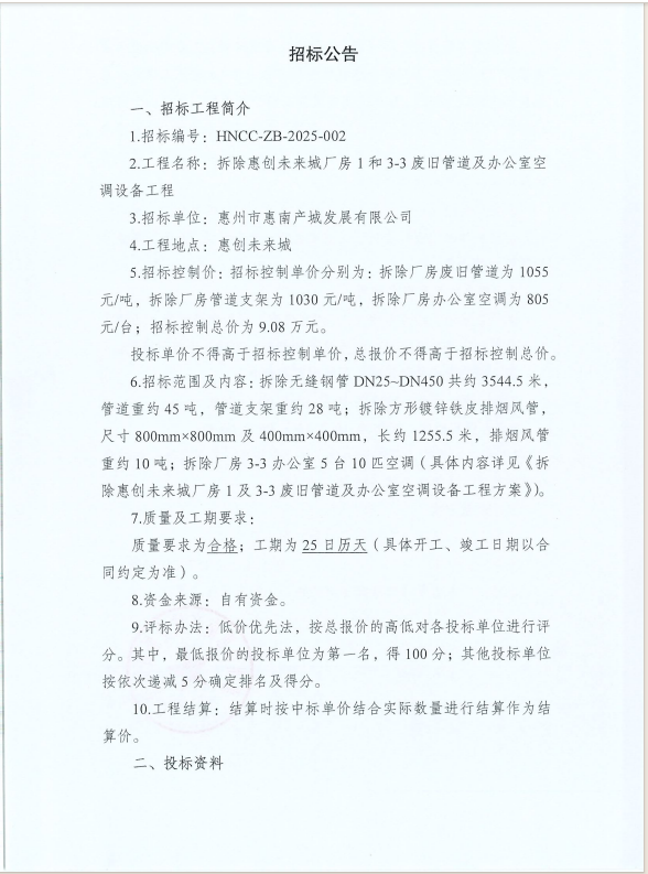 【招標公告】拆除惠創(chuàng)未來城廠房1和3-3廢舊管道及辦公室空調(diào)設(shè)備工程