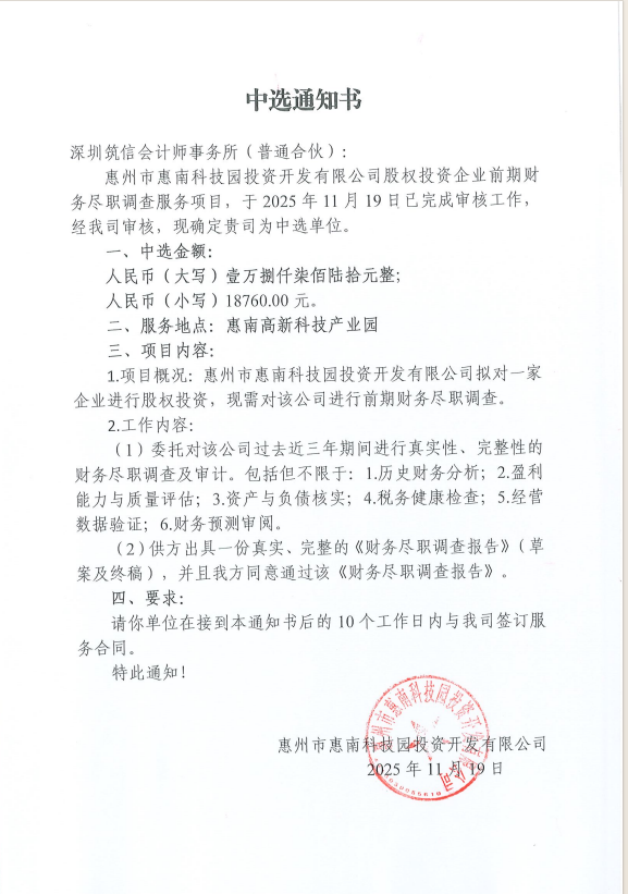 【中選通知】惠州市惠南科技園投資開發(fā)有限公司股權(quán)投資企業(yè)前期財務(wù)盡職調(diào)查服務(wù)項目