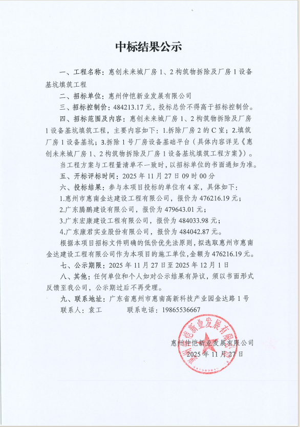 【中標(biāo)結(jié)果公示】惠創(chuàng)未來(lái)城廠(chǎng)房 1、2構(gòu)筑物拆除及廠(chǎng)房1設(shè)備基坑填筑工程