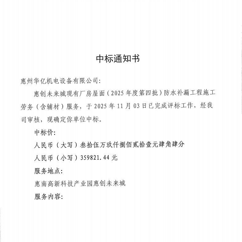 【中標(biāo)通知】惠創(chuàng)未來城現(xiàn)有廠房屋面(2025年度第四批)防水補(bǔ)漏工程施工勞務(wù)(含輔材)服務(wù)