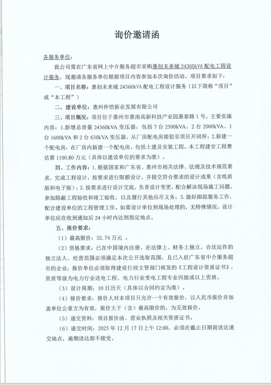【詢(xún)價(jià)邀請(qǐng)函】采購(gòu)惠創(chuàng)未來(lái)城24360kVA配電工程設(shè)計(jì)服務(wù)