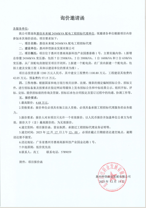 【詢價(jià)邀請函】選取惠創(chuàng)未來城24360kVA配電工程招標(biāo)代理單位