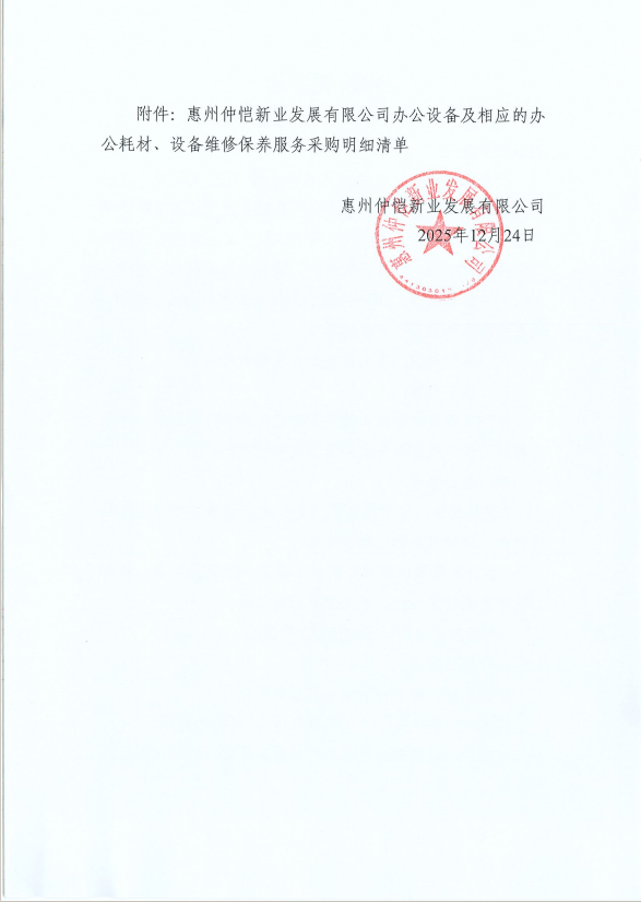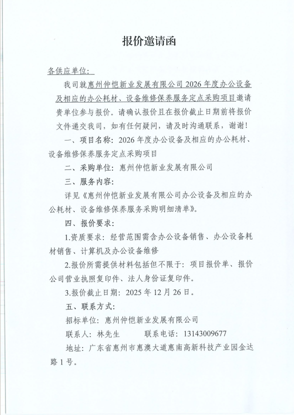 【報價邀請函】惠州仲愷新業(yè)發(fā)展有限公司2026年度辦公設(shè)備及相應(yīng)的辦公耗材、設(shè)備維修保養(yǎng)服務(wù)定點采購項目