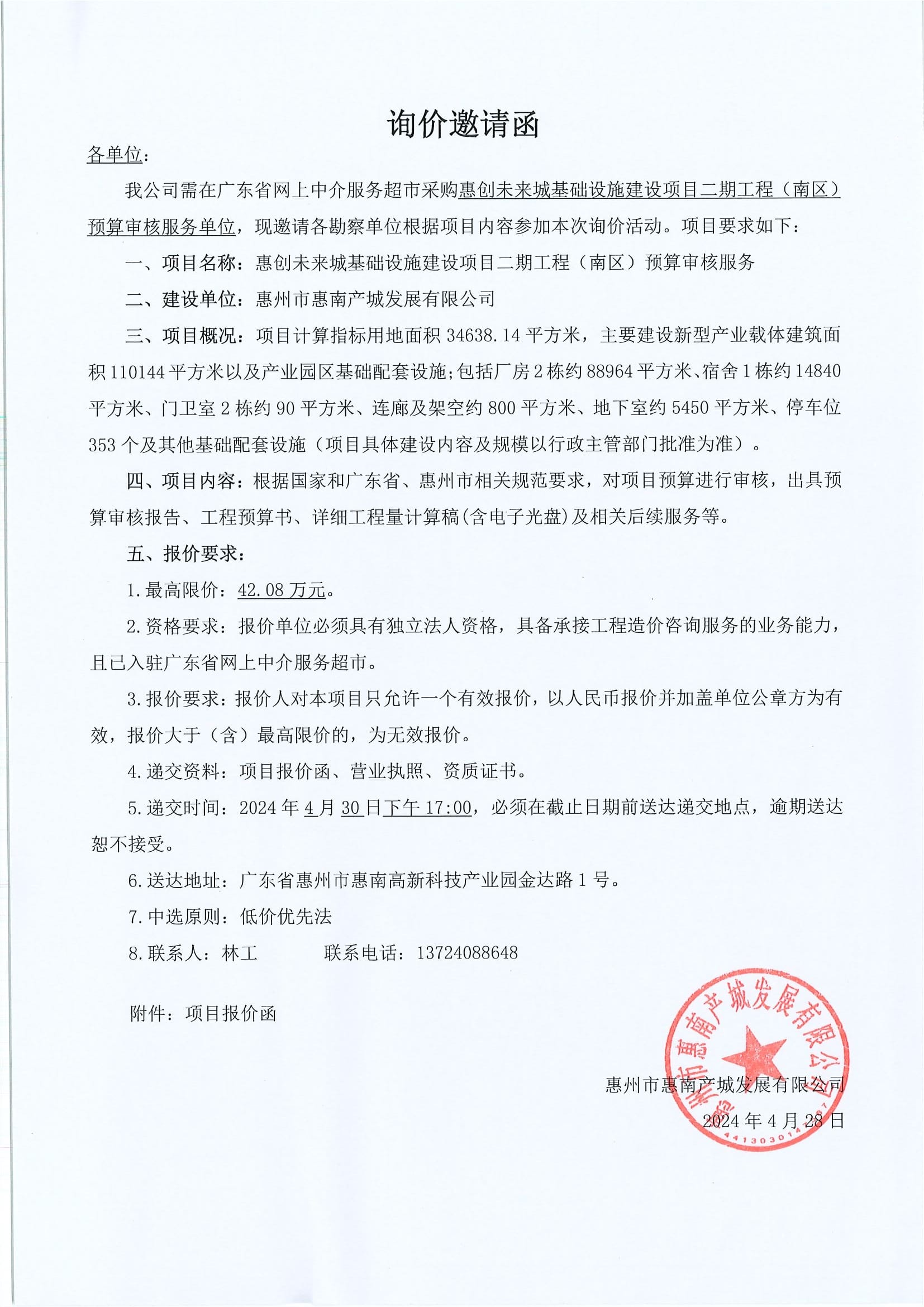 惠創(chuàng)未來(lái)城基礎(chǔ)設(shè)施建設(shè)項(xiàng)目二期工程(南區(qū))預(yù)算審核服務(wù)詢價(jià)邀請(qǐng)函