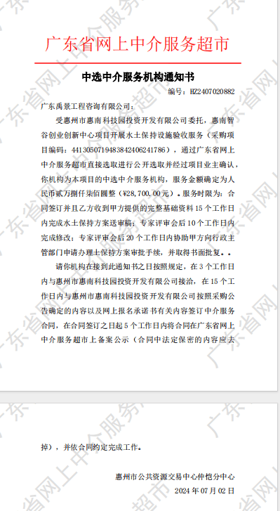 【中選通知】惠南智谷創(chuàng)業(yè)創(chuàng)新中心項(xiàng)目開(kāi)展水土保持設(shè)施驗(yàn)收服務(wù)