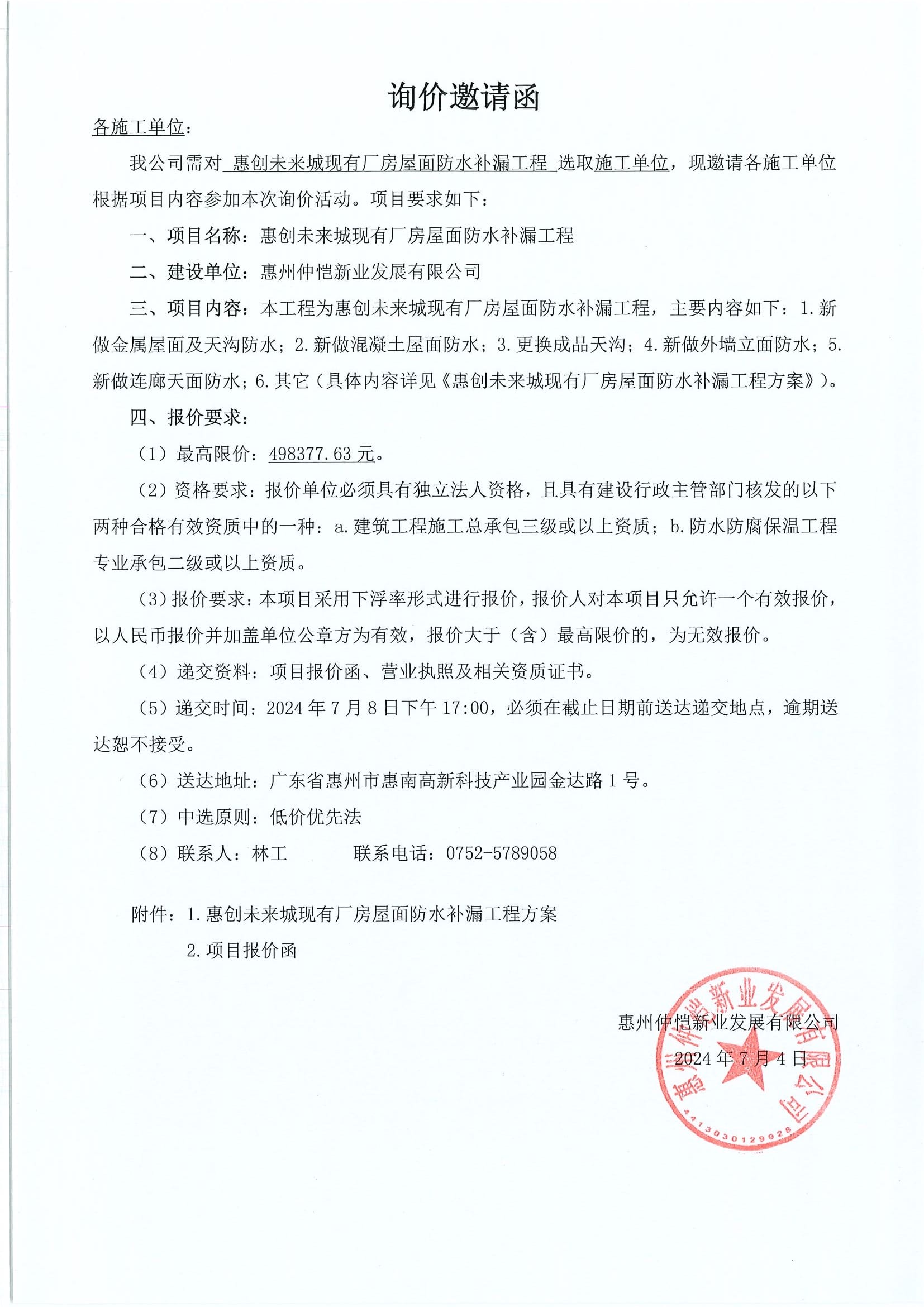 惠創(chuàng)未來城現(xiàn)有廠房屋面防水補(bǔ)漏工程詢價(jià)邀請函