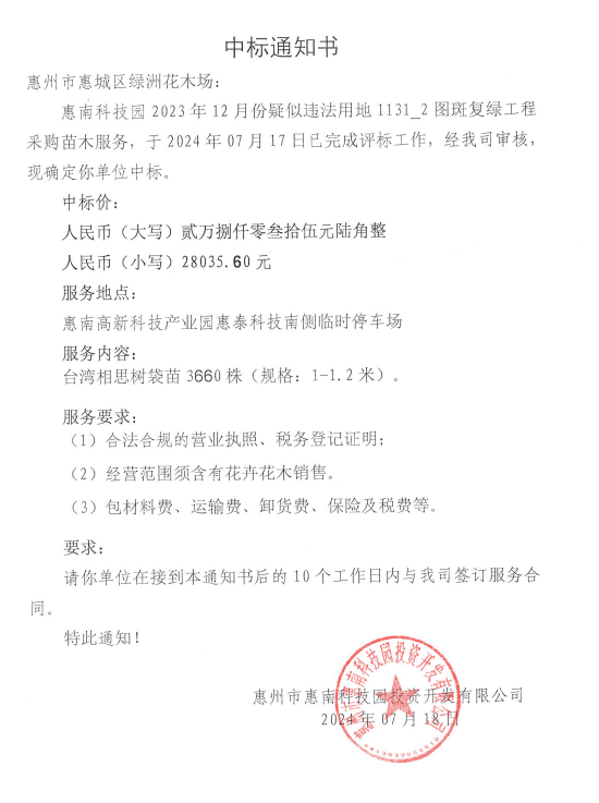 【中標(biāo)通知】惠南科技園2023年12月份疑似違法用地1131_2圖斑復(fù)綠工程采購苗木服務(wù)