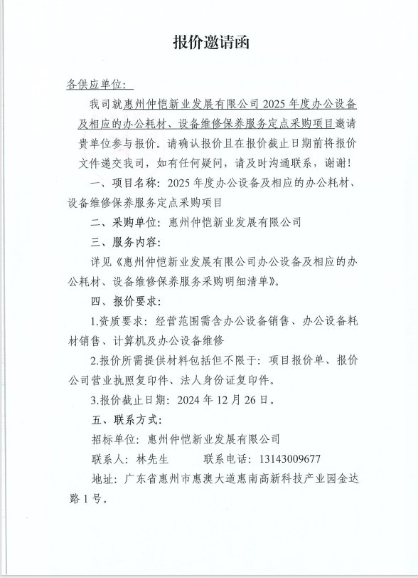 惠州仲愷新業(yè)發(fā)展有限公司2025年度辦公設(shè)備及相應(yīng)的辦公耗材、設(shè)備維修保養(yǎng)服務(wù)定點采購邀請函