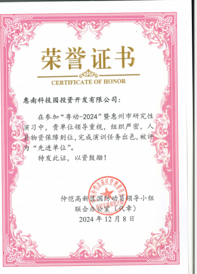 我司榮獲“粵動(dòng)-2024”暨惠州市研究性演習(xí)的“先進(jìn)單位”。