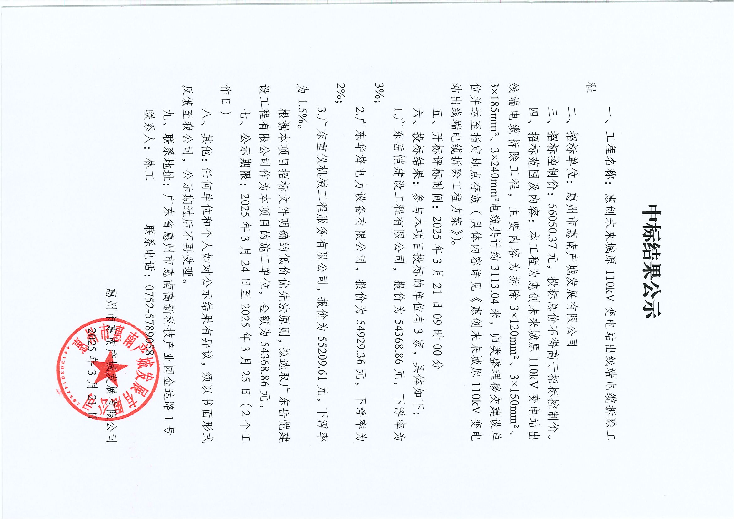 【中標(biāo)結(jié)果公示】惠創(chuàng)未來(lái)城原110kV變電站出線(xiàn)端電纜拆除工程