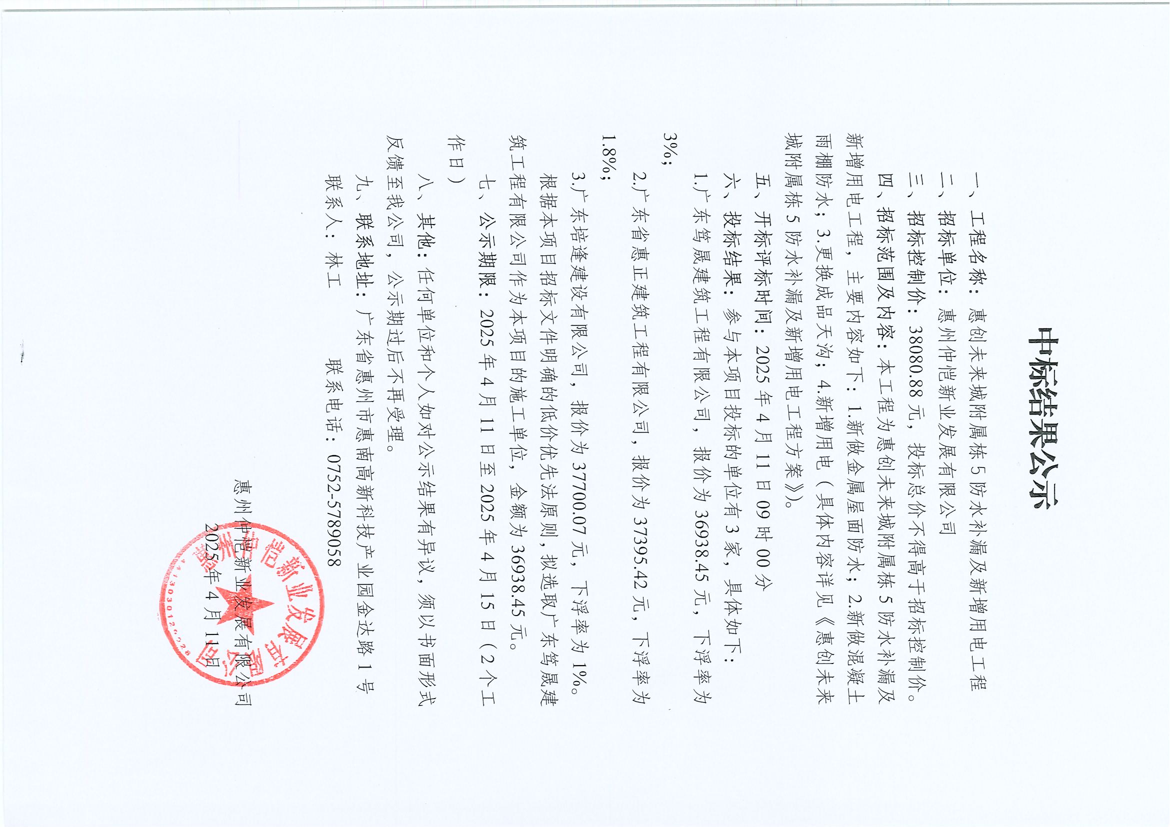 【中標結果公示】惠創(chuàng)未來城附屬棟5防水補漏及新增用電工程