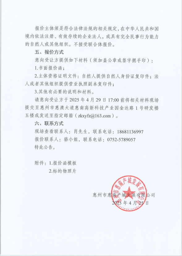 【招標(biāo)公告】惠州市惠南產(chǎn)城發(fā)展有限公司 資產(chǎn)公開詢價及意向受讓方征集公告