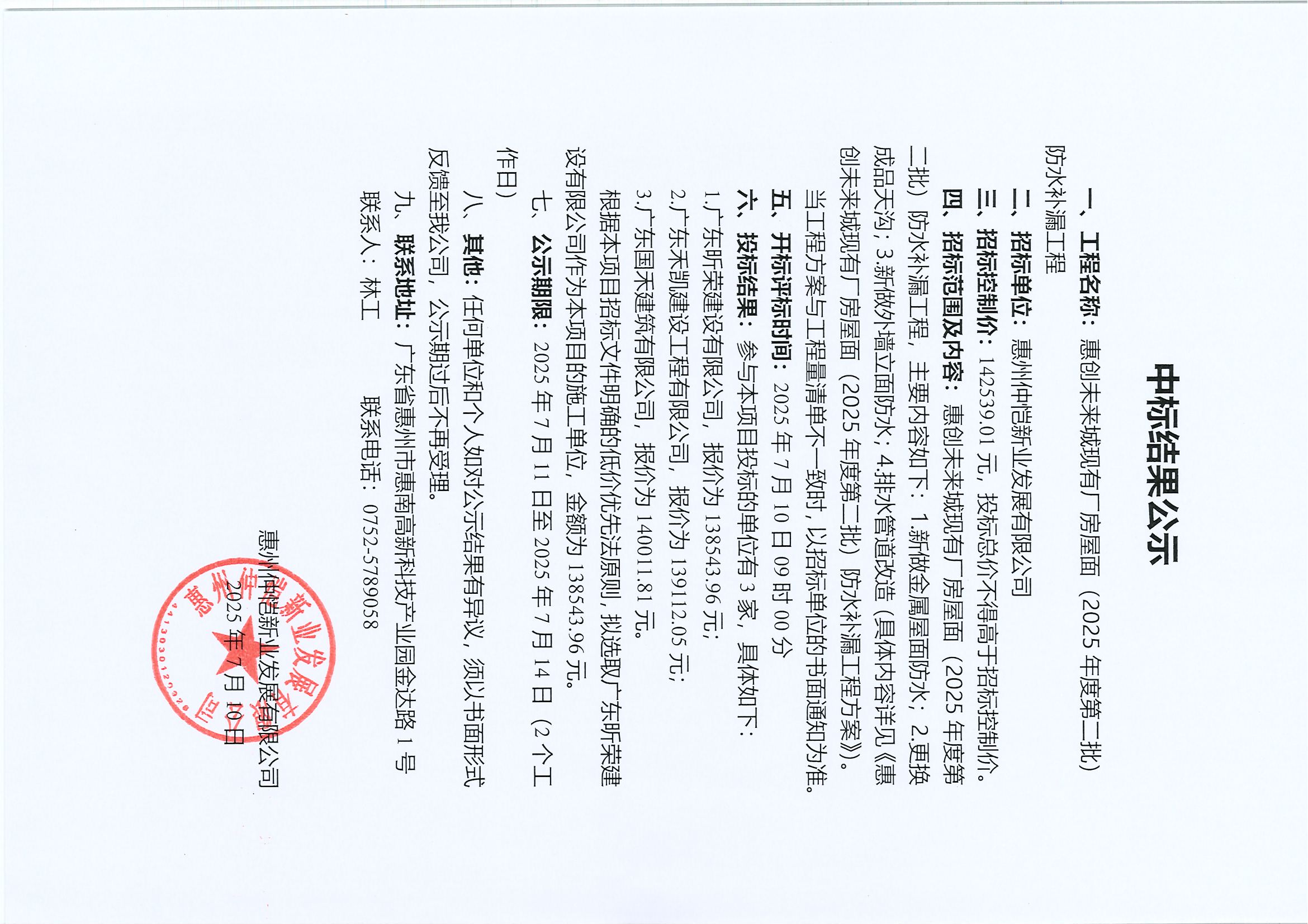 【中標(biāo)結(jié)果公示】惠創(chuàng)未來(lái)城現(xiàn)有廠房屋面(2025年度第二批)防水補(bǔ)漏工程