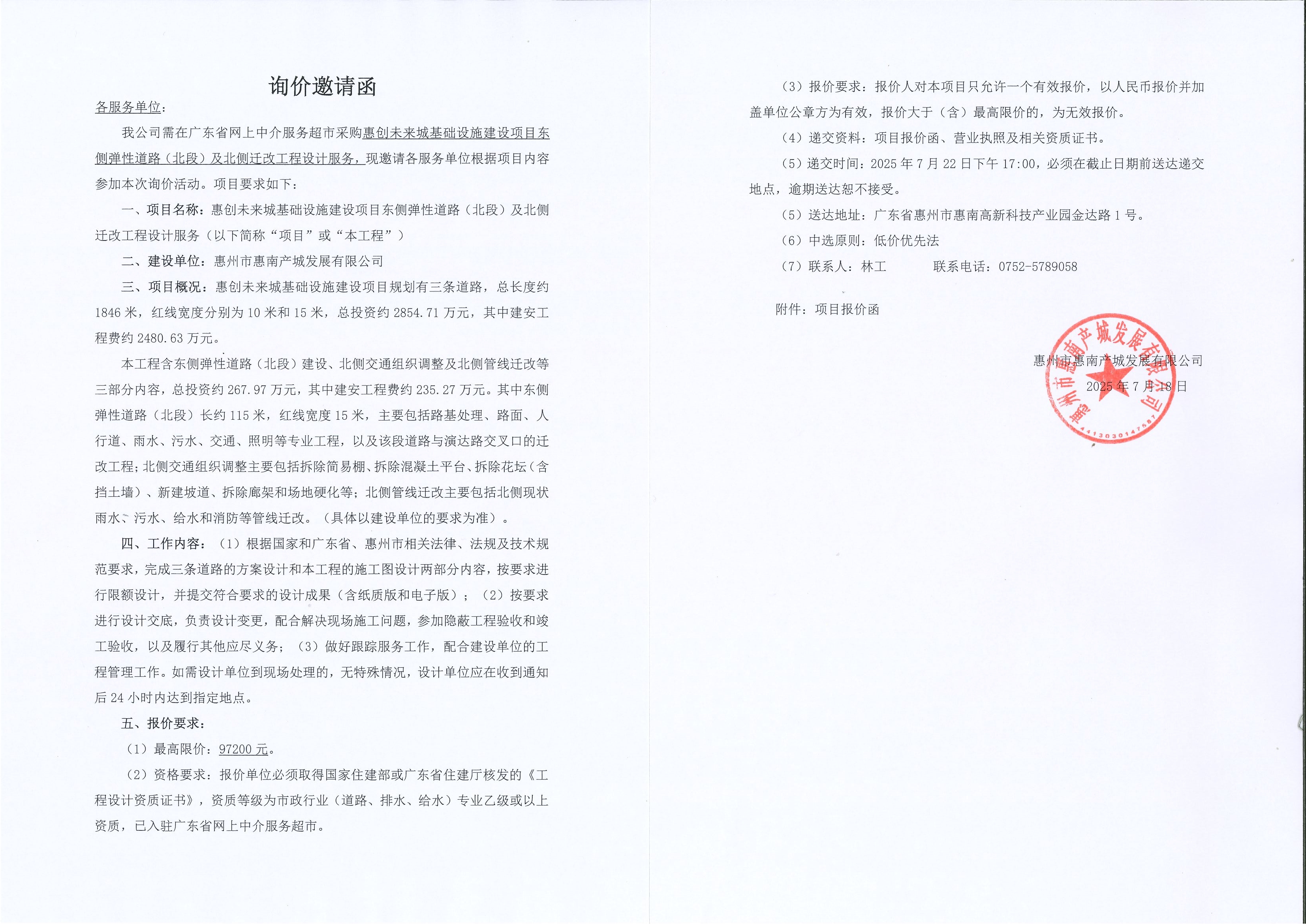 【詢(xún)價(jià)邀請(qǐng)函】惠創(chuàng)未來(lái)城基礎(chǔ)設(shè)施建設(shè)項(xiàng)目東側(cè)彈性道路(北段)及北側(cè)遷改工程設(shè)計(jì)服務(wù)