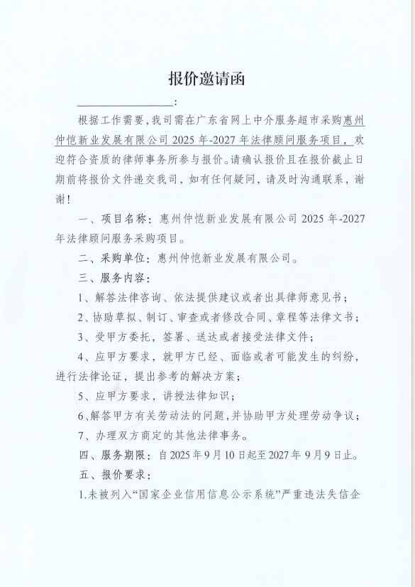 【報價邀請函】惠州仲愷新業(yè)發(fā)展有限公司2025年-2027年法律顧問服務(wù)采購項(xiàng)目