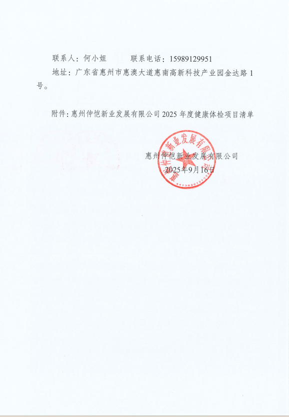 【報價邀請函】惠州仲愷新業(yè)發(fā)展有限公司2025年度職工健康體檢項目