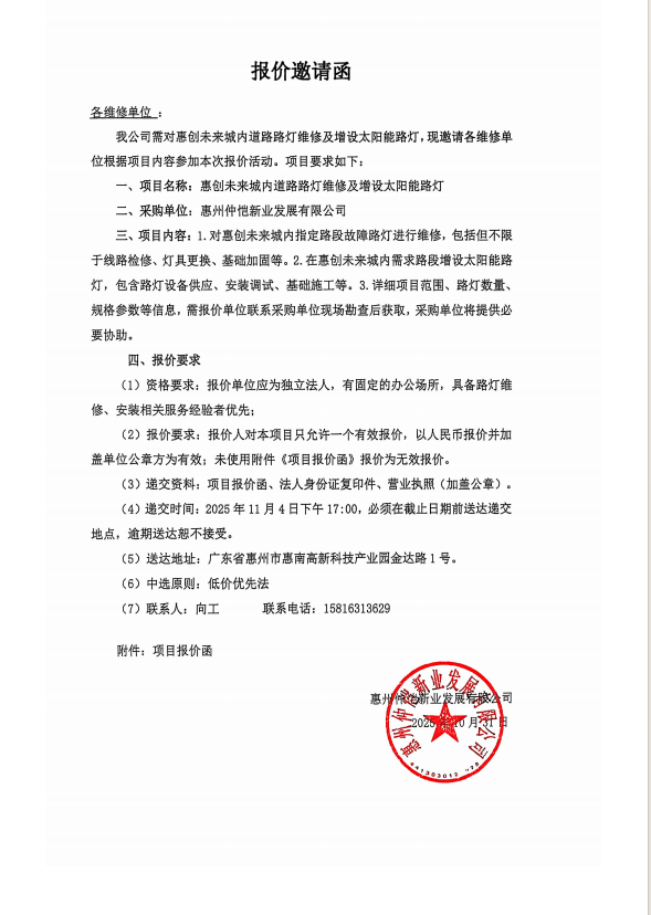 【報價邀請函】惠創(chuàng)未來城內(nèi)道路路燈維修及增設太陽能路燈